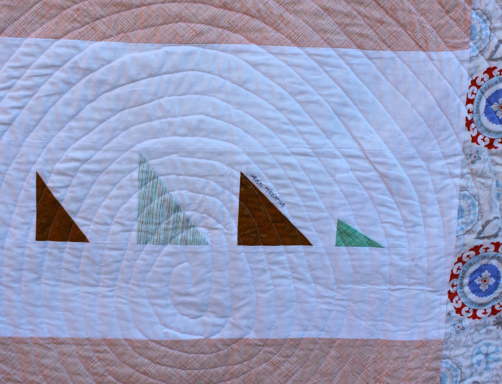 Quilted: By me on my home sewing machine in a classic infinity loop with Aurifil Thread.